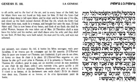 English and French translations appear opposite the original Hebrew text of the Torah. The English translation that appears opposite the Masoretic text in Hebrew is from the Jewish Family Bible, which appeared in London in 1884.